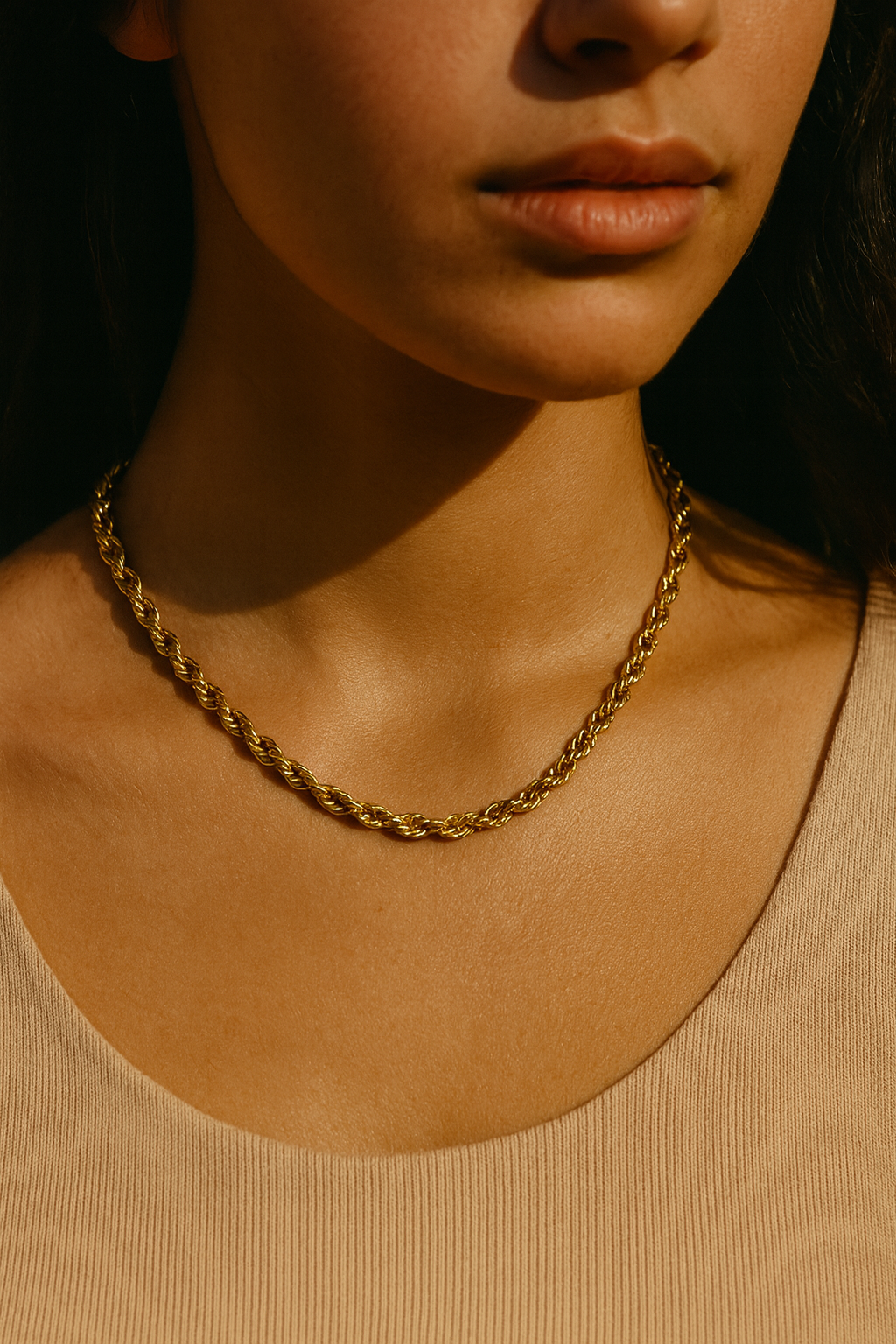 A golden rope chain woven with graceful precision, its intertwined links capturing both strength and softness. The fluid texture reflects light from every angle, embodying timeless elegance—a modern heirloom that feels as natural as it looks luxurious.